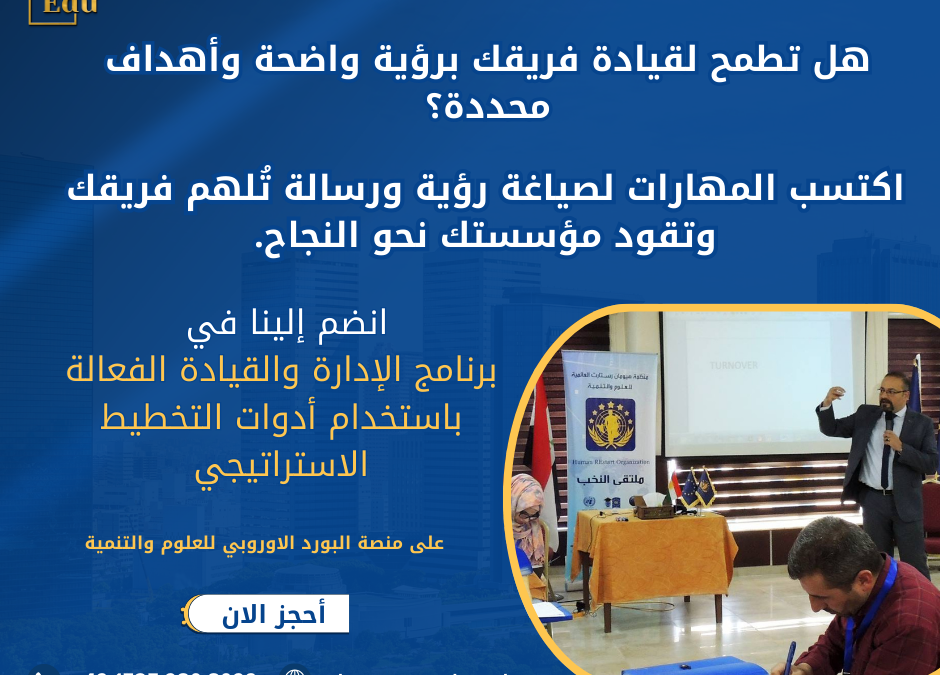 انضم إلى برنامج الإدارة والقيادة الفعالة وتعلّم كيف تصيغ رؤية ورسالة تعكس قيمك وتدفع مؤسستك نحو مستقبل مشرق!